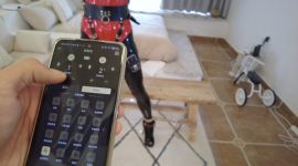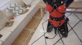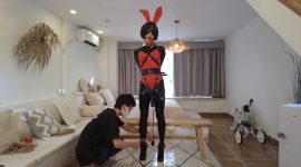 今日は趣向を変えて、彼女をキャットバニーにしてみました。黒エナメルキャットスーツの上に赤エナメルレオタードを合わせ、各種装具を付けてガチガチに固定しております。股間に付けられた電マが良い働きをしているようで、切ない声が漏れております。後半は彼女を開脚状態で座らせ、さらなる玩具責めや呼吸制御を…。